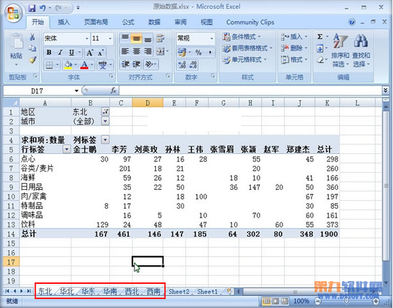 ⑤這樣,從下方標簽中可以看到東北、華北、華東、華南、西北和西南各個地區的數據報表,將一個整體的報表進行了分頁。