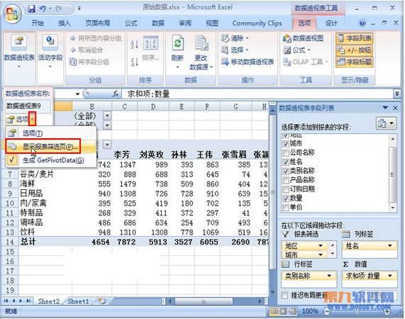 ③單擊數據透視表,點擊選項旁的小三角箭頭,顯示報表篩選頁。