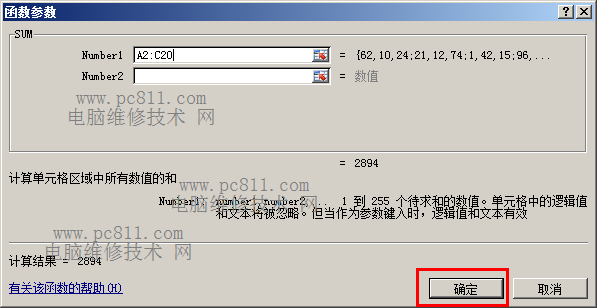第7步: 再次回到Excel求和函數參數窗口,單擊確定或按鍵盤中的回車鍵進行確認。