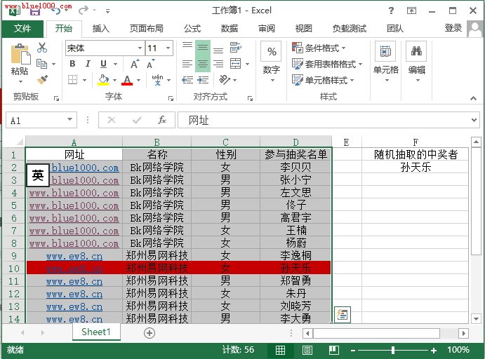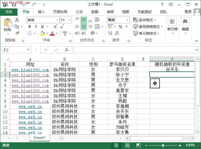 我們www.ew8.cn 鄭州易網科技有限公司的孫天樂是我們的獲獎者,很明確的表示出來了吧?嗯哼!這個Excel2013表格制作的抽獎系統不錯吧?哦,最后告訴你按下F9鍵刷新,就會重新抽獎。好了blue1000今天講的這個利用Excel2013去制作一個隨機抽獎的系統是不能夠作假的,沒有貓膩的公平的隨機抽獎系統,你要是需要認為控制的抽獎呢,且聽有時間再告訴你。