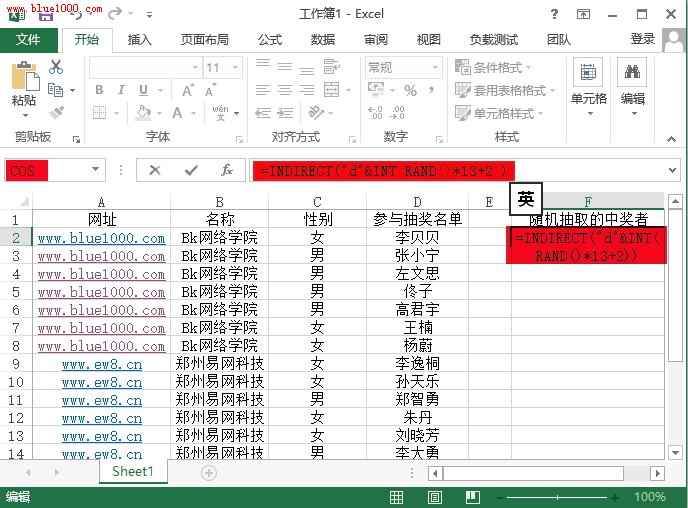 3. 公式的意義是:int函數返回一個2-14的隨機整數,和d串聯就會返回D2:D14之間的隨機單元格,最后,indirect會返回隨機單元格里面的姓名。