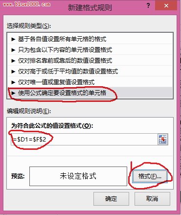 5. 選擇最后一個規則類型,途中已用紅線標出來了,使用公式確定要設置格式的單元格,輸入公式:=$D1=$F$2,點擊格式按鈕。
