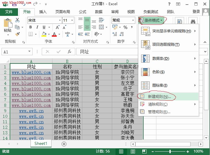 4. 選中從A到D,單擊菜單欄--條件格式--新建規則選項。