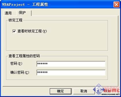 3、選擇“工具/VBAProject屬性”命令,打開“VBAProject工程屬性”對話框,選擇“保護”選項卡,勾選“查看時鎖定工程”,并設置查看工程屬性的密碼,單擊“確定”按鈕(如圖2)。