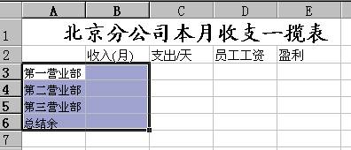 步驟二、在B2、C2、E2、F2單元格中分別輸入“收入/月”、“支出/天”、“員工工資”、“盈利”欄目名稱,如圖 3所示。接著分別在A3、A4、A5、A6單元格中輸入“第一營業部”、“第二營業部”、“第三營業部”、“總結余”項目名。