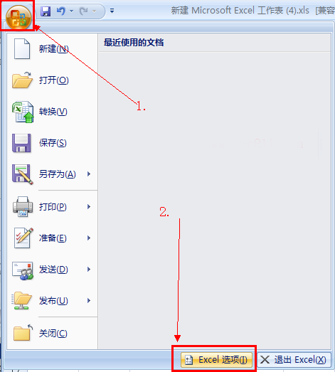 第2步 :打開Excel2007之后,單擊左上角的Office按扭,在彈出的Office菜單中找到并單擊Excel選項。