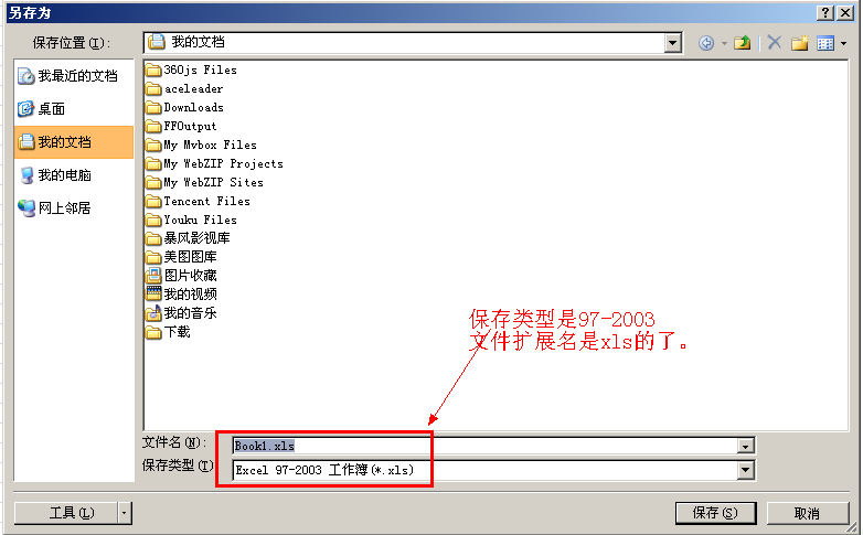 第6步 :這時會彈出一個【另存為】的窗口,在這個窗口中,默認的保存類型是第三步所設置的【Excel97-2003工作薄(*.xls)】,文件的擴展名是.xls。