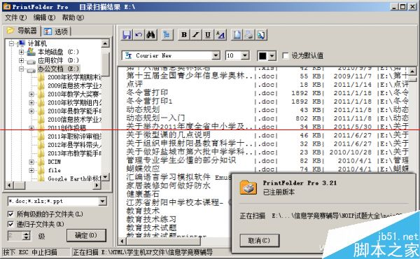 回到“導航器”標簽下,選擇要建立文檔鏈接表的分區或文件夾,這里選擇E盤;在搜索文件類型中輸入*.doc;*.xls;*.ppt,查找三種常用的Office文檔類型,注意不同的文檔類型之間用半角狀態下的分號來分隔;勾選左下方的“遞歸子文件夾”和“所有級數的子文件夾”兩項,單擊“確定”按鈕之后,系統很快就會幫助我們搜索到該分區中所有相關文檔的指定屬性值,并自動以“|”符號分隔(圖2)。