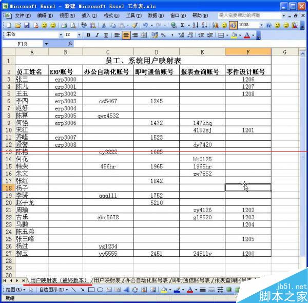 首先,通過Execl新建一名為“映射表”的工作薄,設計好“用戶映射表”的結構,導入所有員工姓名(圖1)。其次,將從各應用系統數據庫中導出的賬號表保存為Execl表格,并導入至“映射表”工作簿中,并統一修改內容,僅保留賬號表中的姓名和賬號兩字段。