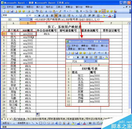“=VLOOKUP(用戶映射表!A3,ERP賬號表!$A$3:$B$11,2,0)”,意思即為, 在“ERP賬號表”的A3至B11區域中,查找“用戶映射表”的A3格數據,如匹配,則將“ERP賬號表”中的第二列(即B列)的數據,拷貝至B3表格中。由于在公式中的“用戶映射表!A3”采用相對值,所以,選中B3列,向下拉動鼠標在數據區拖拉填充公式即可。