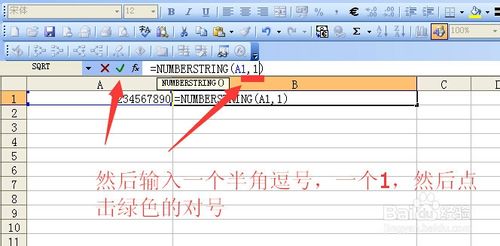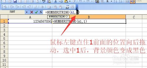 鼠標(biāo)左鍵點一下b1單元格,然后輸入=numberstring(),然后將鼠標(biāo)左鍵點擊一下括號內(nèi)部