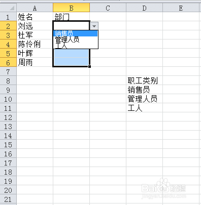 對話框出來后,設置有效性條件允許“序列”,數據來源為“銷售員,管理人員,工人”(中間間隔符號為英文標點符號)
