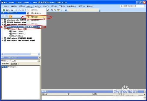 2、在Excel界面上按Alt+F11,進入VBE窗口,在左邊“工程”窗口中點選出問題的那個工作簿,然后插入一個模塊