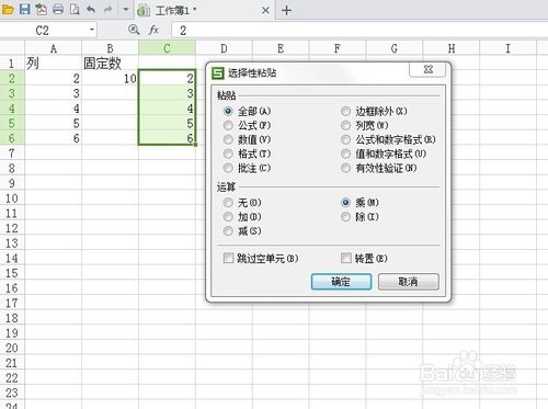3、假設(shè)是A列,要剩固定數(shù)(10),先復(fù)制A列到C列空處白粘貼,然后復(fù)制固定數(shù)(10),最后選中C列那些數(shù)據(jù)單元格,右鍵,選擇性粘貼,勾選:剩 ,確定,即可,如圖下