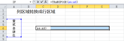 1、選中C6:G6,在編輯欄輸入=TRANSPOSE(A4:A8)