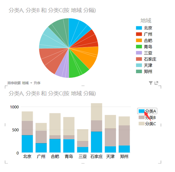 默認配色就很不錯,而且演示的時候點擊時會直接按你點擊的類型幫你顯示對應的數據(例如上面的堆積柱狀圖)