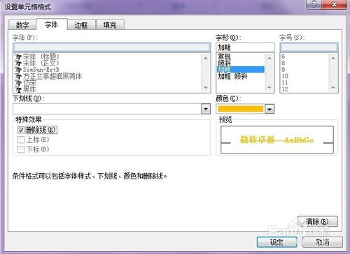 單擊“設(shè)置為”右側(cè)的箭頭,從下拉列表中選擇“自定義格式”命令,打開“設(shè)置單元格格式”對話框。在“字體”選項卡下依次設(shè)定字形為“加粗”,特殊效果為“刪除線”,顏色為“黃色”。