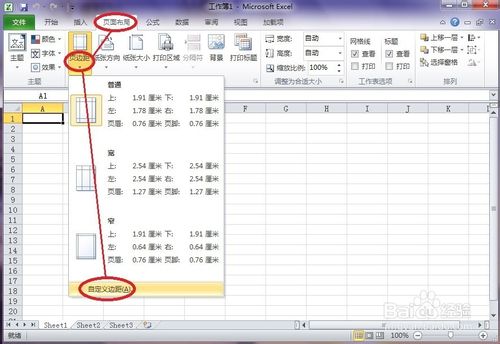 2、點(diǎn)擊工具欄中的“頁面布局”,再在子菜單中選擇“頁邊距”,然后在下拉菜單中選擇“自定義邊距”。