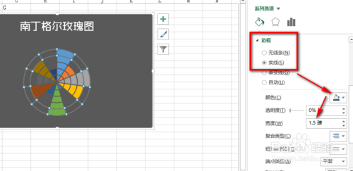 8、但是這樣由于背景色的變化導致圓環圖又現原形了,不要著急,這是由于半圓環的邊緣線條是填充為白色而已,那么只要填充為背景色就解決問題了。我們選擇已經填充為無色的圓環——就是不需要的那些半圓環,點擊線條——無線條或者實線 (善用F4鍵),若選擇實線 的話,其顏色和底板背景色相同即可,也可以調整線條的磅值來調整線條的粗細