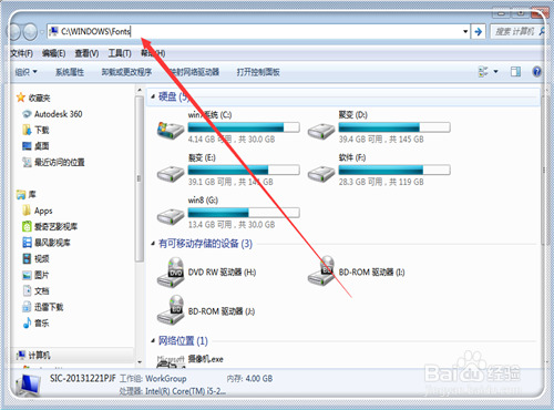 2、復制引號內內容“C:WINDOWSFonts”。點擊計算機進入。
