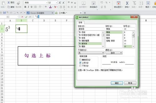在單元格格式中勾選“上標”;