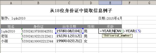 其中C5是出生日期所在列,雙擊年齡所在列,然后輸入下面公式=YEAR(NOW())-YEAR(C5)