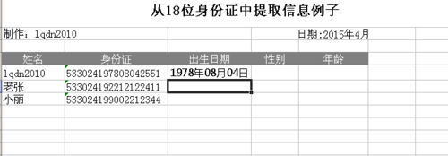 18位的新一代身份證了,里面的數字都是有規律的。前6位數字是戶籍所在地的代碼,7-14位就是出生日期。第17位“2”代表的是性別,偶數為女性,奇數為男性。我們要做的就是把其中的部分數字利用了涵數“提取出來”。