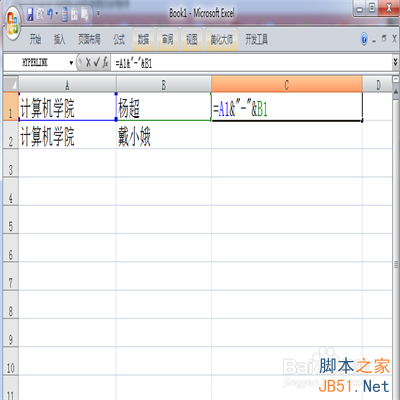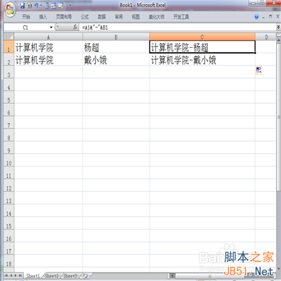 7、在C1單元格中輸入公式”=A1&"-"&B1“按回車鍵即可看到數據合并成功。