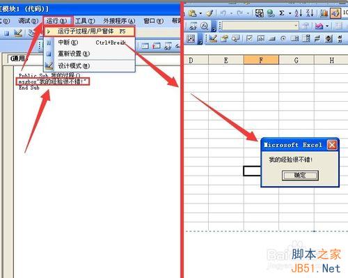 10、將一下代碼寫入剛才插入的空過程代碼中兩行之間 然后點(diǎn)按菜單欄 運(yùn)行命令 運(yùn)行子過程/用戶窗體 或者按F5快捷鍵 此時(shí)界面跳轉(zhuǎn)到excel界面顯示如下提示框