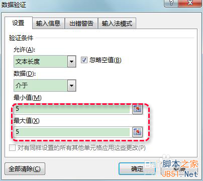 文本長度下“數據”處選擇“介于”,“最大值”與“最小值”均填寫5。