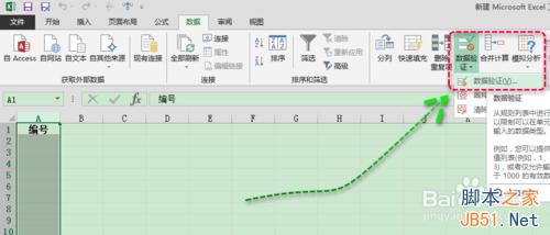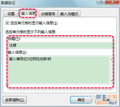 還有呢,在輸入信息前當點擊單元格時可以讓其顯示輸入提醒。這個操作還是在“數據驗證”下,在“輸入信息”選項卡。小編的提醒設置為“標題:注意 內容:請輸入編號為5為阿拉伯數字”。