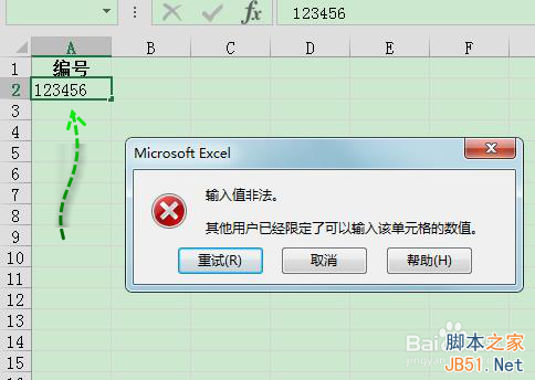 確定后試試在A列輸入“123456”不會成功并彈出錯誤警告。