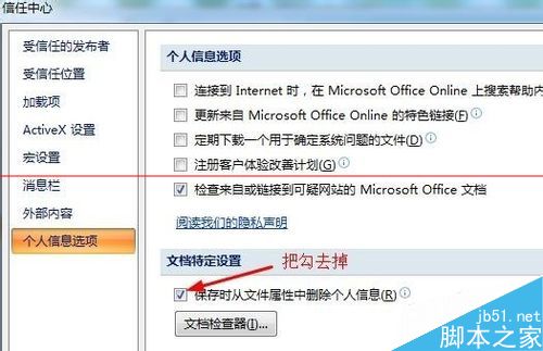 5、在新彈出的界面左側(cè)點擊“個人信息選項”,將右側(cè)的“保存時從文件屬性中刪除個人信息”前的勾去掉。