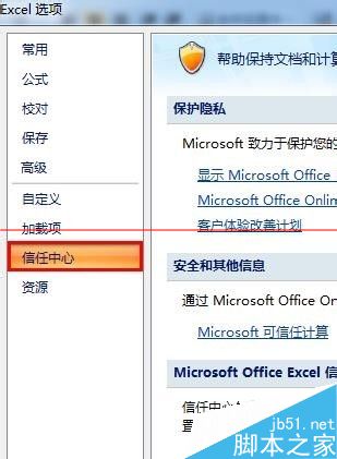 3、在彈出的窗口選擇左側(cè)的“信任中心”。