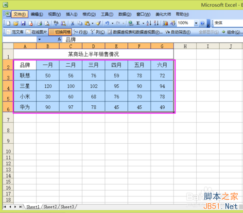 1、首先在我們制作出我們需要的表格,第一步選中數據,不要選擇“某商場上半年銷售情況“這一單元格,因為它是已經合并了的。
