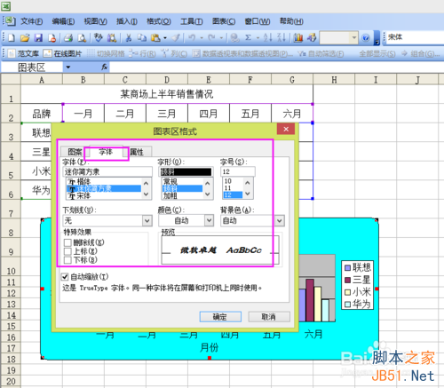3、在圖表標題內輸入相應的標題,X軸為月份,Y軸為銷量,預覽效果會在右邊顯示出來。
