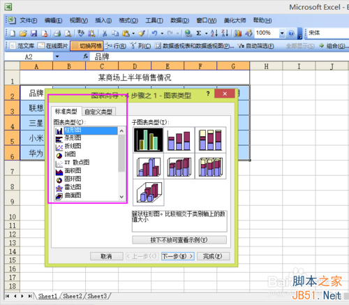 2、接下來,選擇插入——圖表。這里面有非常多的圖表樣式,我們先選擇一個最簡單的柱形圖表,然后下一步。