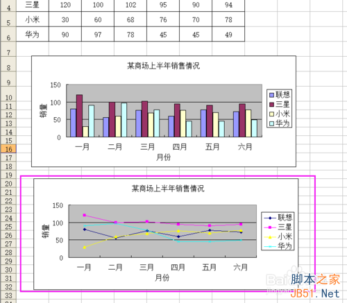 5、表格中數據的更改,圖表也隨之更改。我們可以試一下,把聯想一月份的銷量改為80,來看一下,圖表也隨之改成了80。這說明,圖表和表格之間是完全對應的。