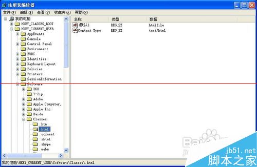 2、在注冊表中,導航到HKEY_CURRENT_USERSoftwareClasses.html 項