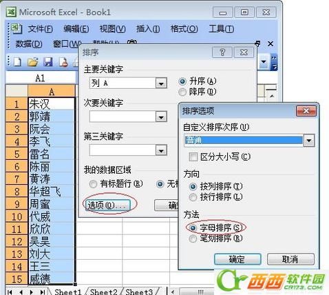 步驟二、選擇排序方式以后,回到Excel工作表中,依次選中所有需要排序的單元格,然后單擊菜單欄的“數據”-->排序-->選項,在彈出的“排序選項”中選擇“字母排序”,然后確定,確定,如圖;