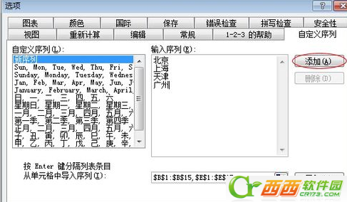 步驟一、打開菜單欄的“工具”-->選項,然后在彈出的“選項”窗口中選擇“自定義序列”,在右邊的“輸入序列”中依次輸入北京、上海、天津、廣州,每輸入一個地點時,就回車一次,輸入完成后點擊“添加”按鈕;(如圖)