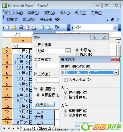 步驟三、選中以后,單擊“數據”-->排序-->選項,在“自定義排序次序”中找到剛才添加的“北京,上海,天津,廣州”這種排序方式,然后確定;