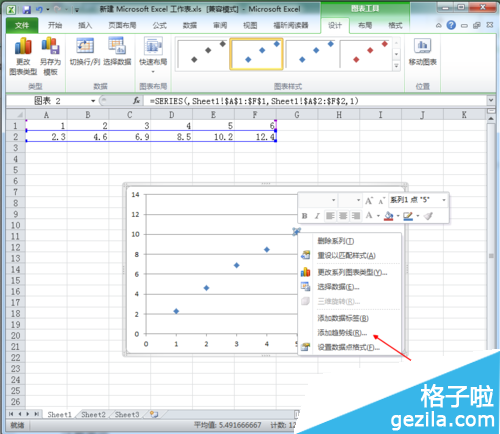 第三步:選中散點圖之后,會出現(xiàn)圖表,點擊上面的任何一點。然后右擊,選擇添加趨勢線。