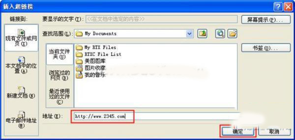 打開“插入超鏈接”對話框,你可以輸入網站地址,也可以選擇本地的文件等,選擇完成后點擊“確定”按鈕。