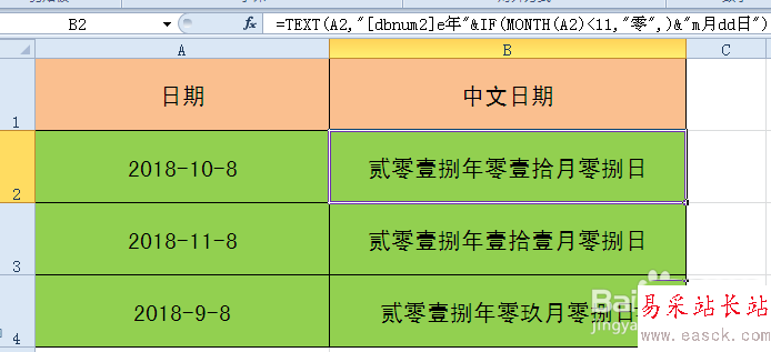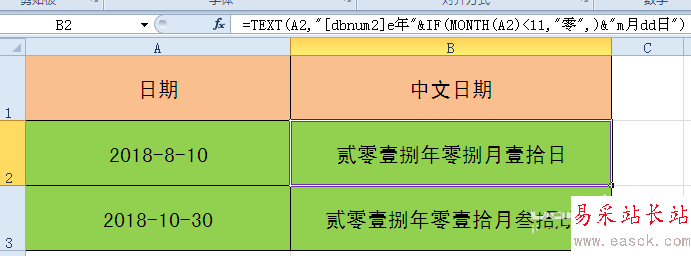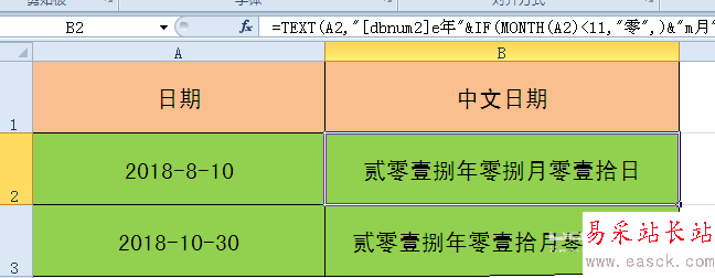 4、但當月份為“壹拾”時,前面也需要加“零”,因此要先判斷下月份是否為10,如果是,則要補充“零”,如果不是按原方式返回:=TEXT(A2,"[dbnum2]e年"&IF(MONTH(A2)=10,"零",)&"mm月dd日")