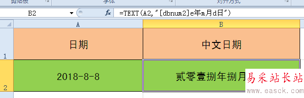 2、而“[dbnum2]”則是將數值轉換為中文大寫:=TEXT(A2,"[dbnum2]e年m月d日")