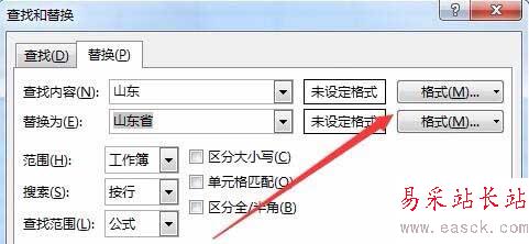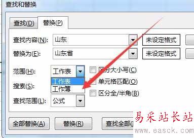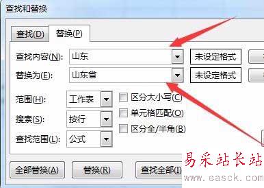 3、在打開的查找和替換窗口中,我們在查找內容處輸入山東,在替換為輸入山東省