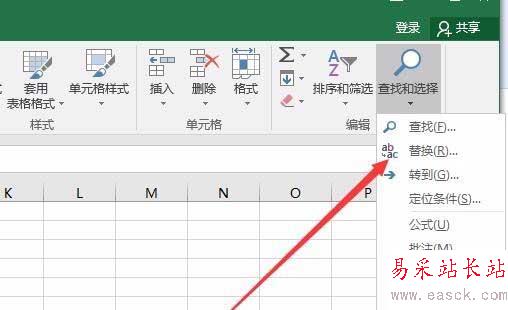 2、這時我們點擊開始工具欄上的“查找和選擇”下拉菜單,在彈出菜單中選擇“替換”菜單項