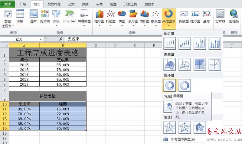 3、接著選擇輔助表格里數(shù)據(jù)區(qū)域a10:b15,執(zhí)行插入-其他圖表命令,從下拉菜單中選擇圓環(huán)圖。