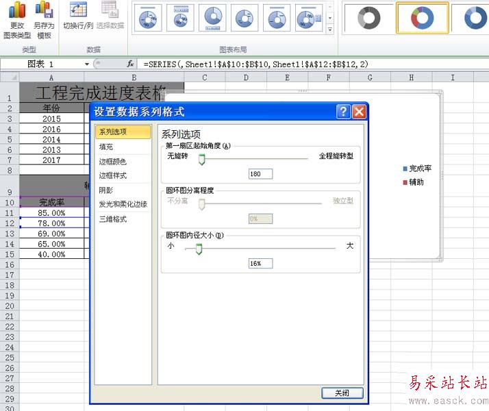 5、右鍵單擊該圓環(huán)圖,從下拉菜單中選擇設(shè)置數(shù)據(jù)系列格式選項(xiàng),在彈出的對話框中設(shè)置圓環(huán)圖內(nèi)徑大小為16%,第一扇區(qū)起始角度為180度。